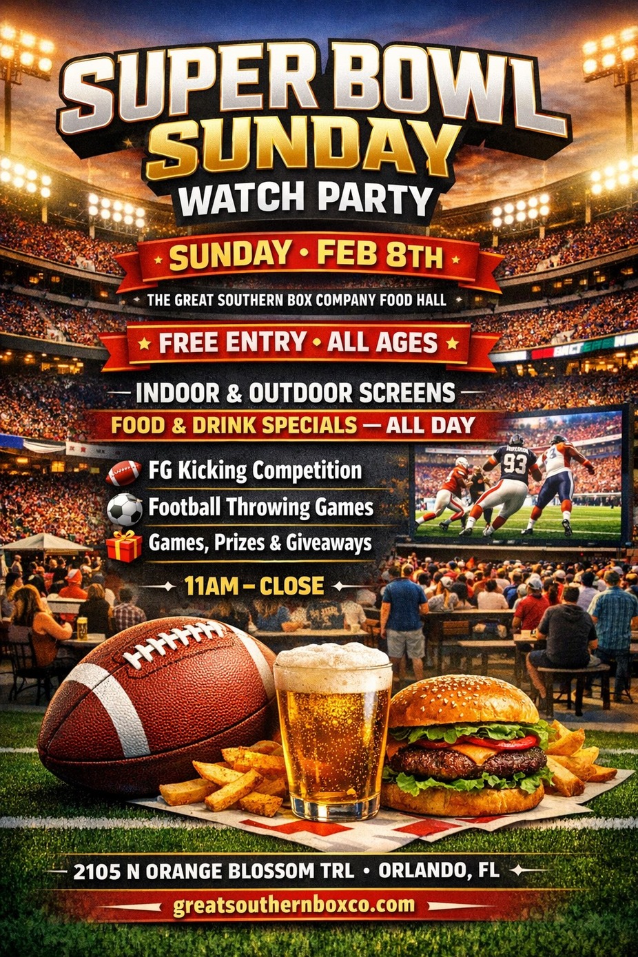 #SuperBowlSunday #OrlandoEvents #WatchParty #FoodHallOrlando #GameDayOrlando #FreeEntry #AllAges #FootballSunday