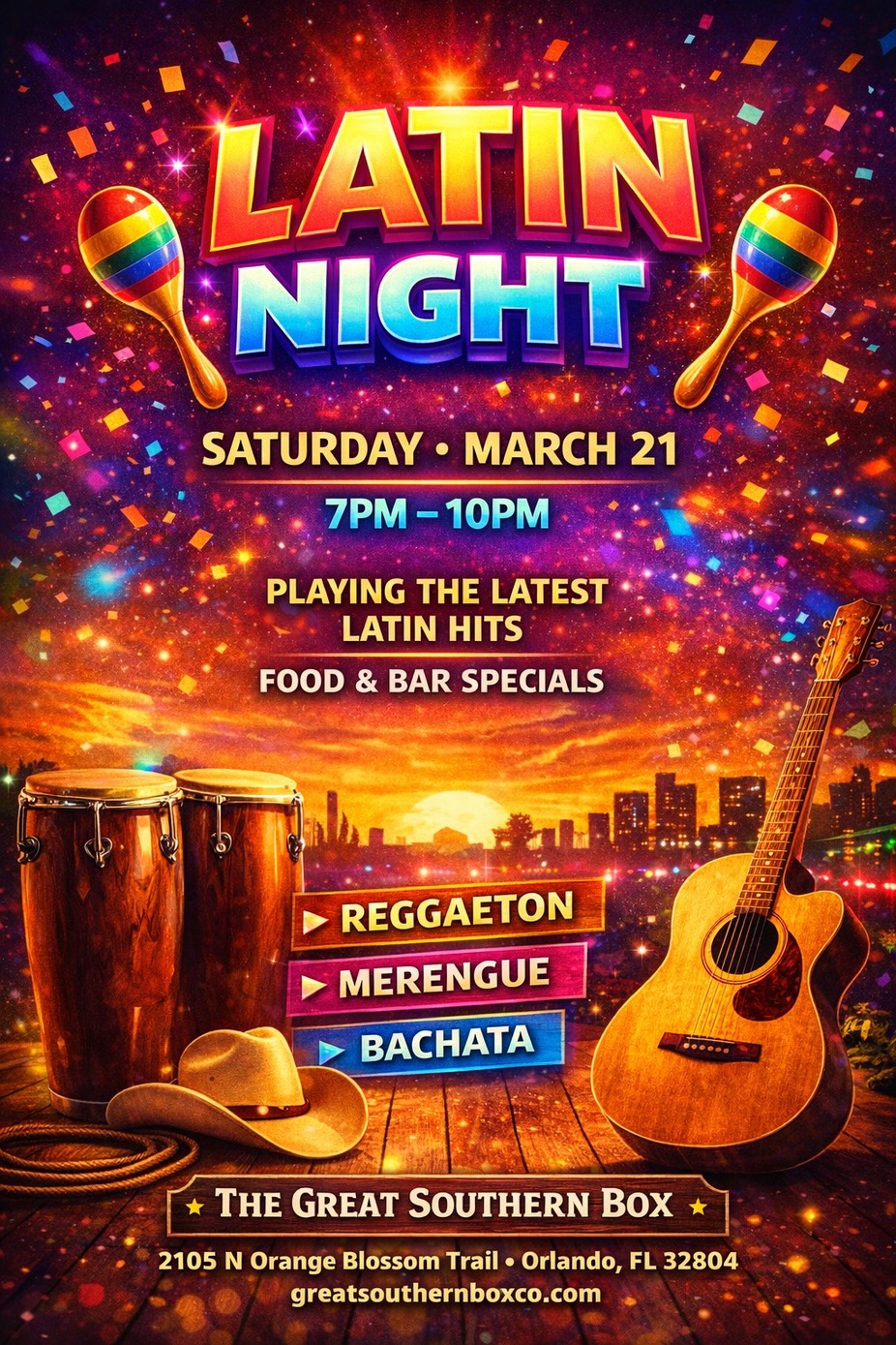 Join us at Great Southern Box Company Food Hall this Saturday, March 21st from 7PM–10PM for a night full of energy, flavor, and nonstop Latin vibes.